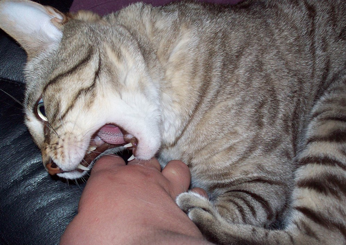 Cats have very sharp, long and pointed teeth that can bury themselves deep into the flesh, causing puncture wounds. Cats usually bite when provoked, especially the female felines. These bites can be much deeper than the victim thinks because the skin can seal off the small punctured site, thus preventing open drainage and leading to infection. While only one percent of dog bites lead to infection that requires hospitalization, up to 10% of cat bites send victims to the hospital for treatment.