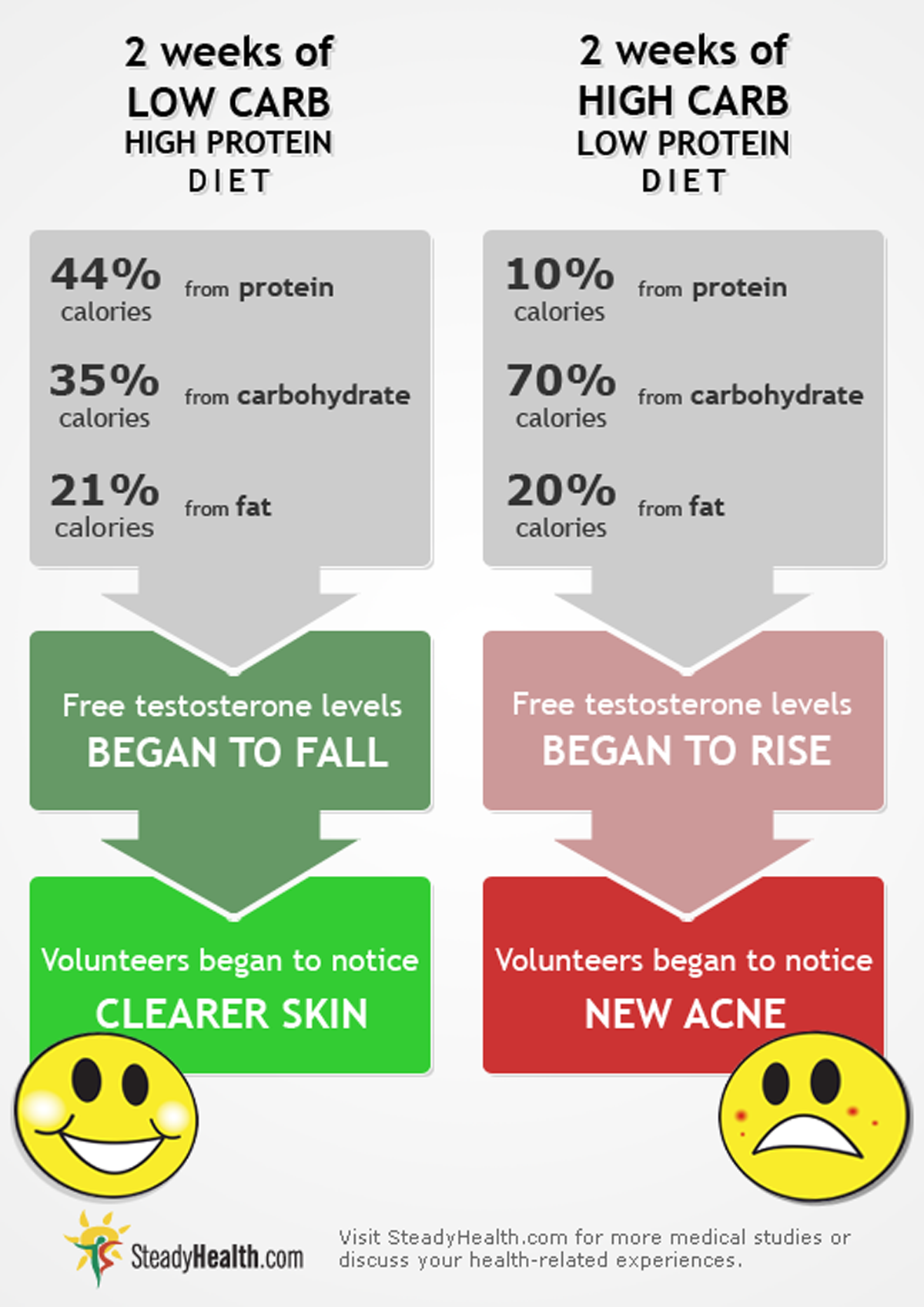 Doctors recruited volunteers who had acne to eat a relatively high-protein diet for two weeks. This diet provided 44% of calories from protein, 35% of calories from carbohydrate, and 21% of calories from fat. In just two weeks, free testosterone levels began to fall and the volunteers began to notice clearer skin.
