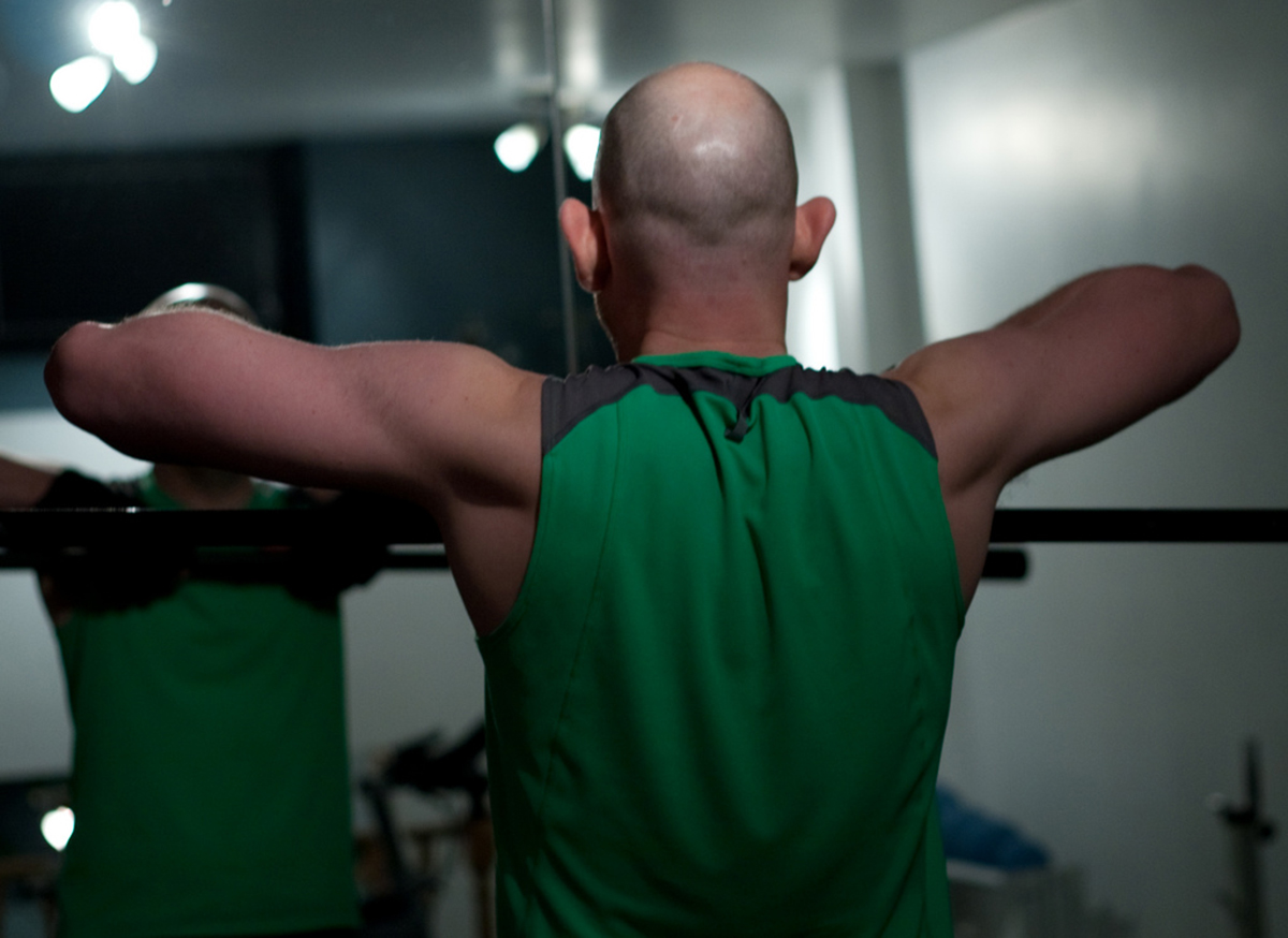 Band resisted press (back): repeat the steps above, this time facing away from the bar. Keep your core tight and allow some stretching of the front of your upper body - let the band pull you into a more extended posture.