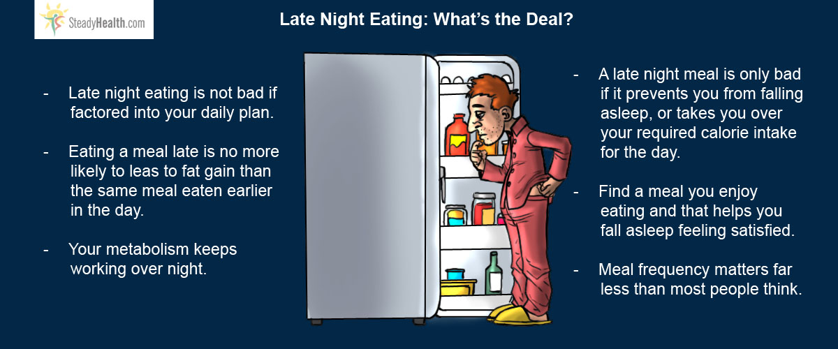 Let’s use an example of a person weighing 150 pounds, who has a maintenance calorie intake of 2,000 per day. If this person had eaten 1,300 calories by 10pm and wanted a late night meal, they could eat something containing 300 to 400 calories and still end the day 300 to 400 calories below their maintenance level, meaning they’ll lose weight, despite eating late.