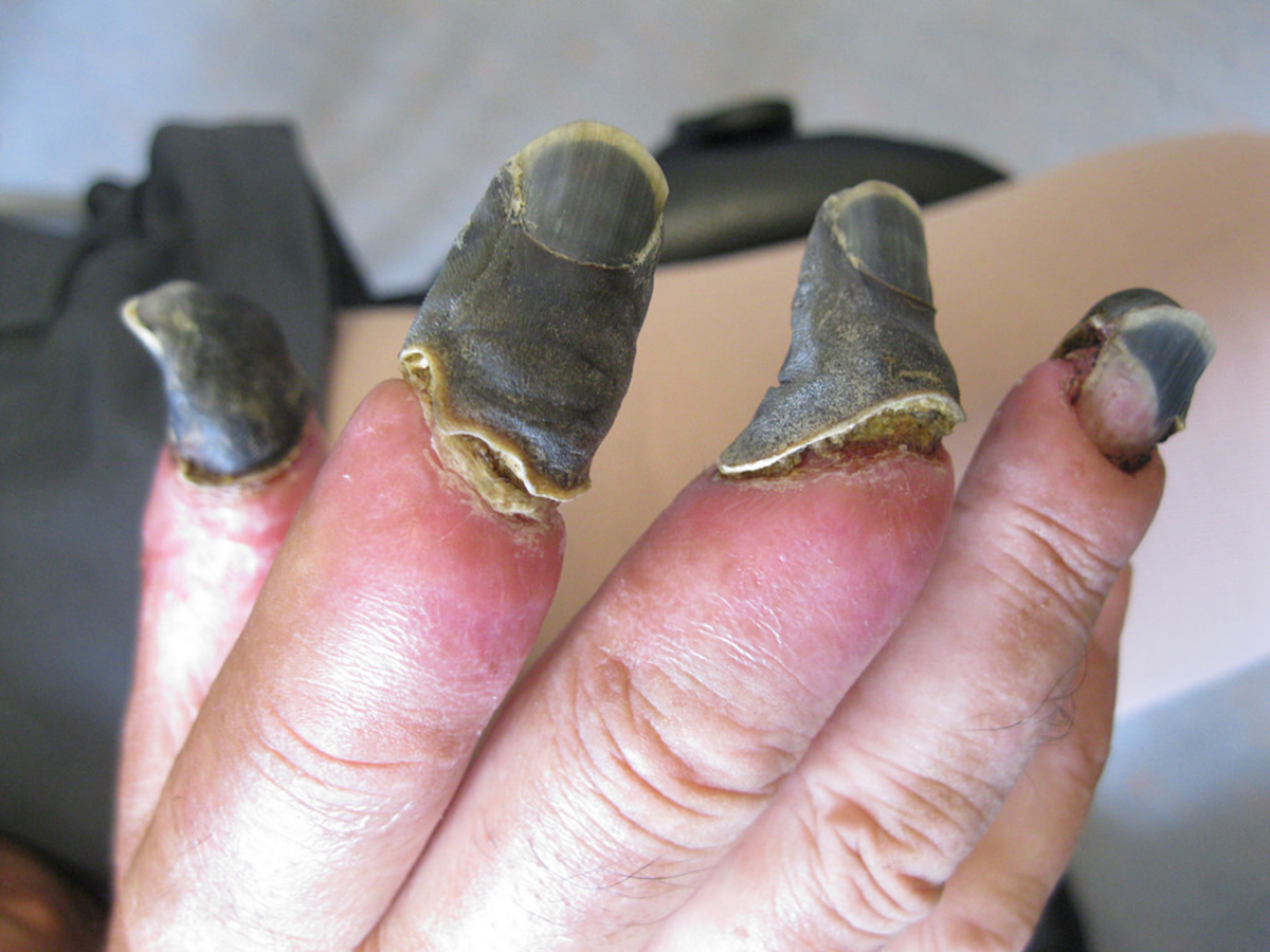 - Skin symptoms. The skin can appear bruised, either with tiny petecchiae or with larger blue and purple spots. It can blister.
