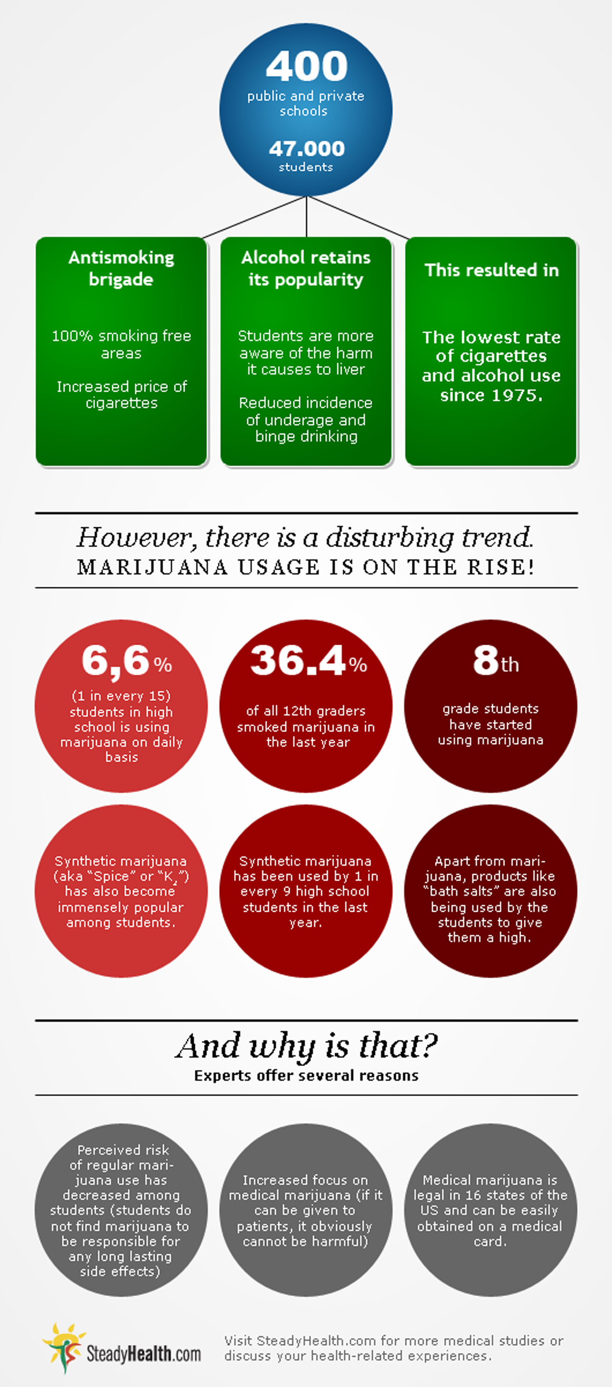 According to experts, this popularity was largely caused by the fact that the perceived risk of regular marijuana use has decreased among students. Unlike cigarette smoking and alcohol use, they do not find marijuana to be responsible for any long lasting side effects. With an increased focus on medical marijuana, the students feel that when it can be given to patients, it obviously cannot be very harmful. Moreover, medical marijuana is legal in an ever-increasing number of states and can be easily obtained on a medical card.