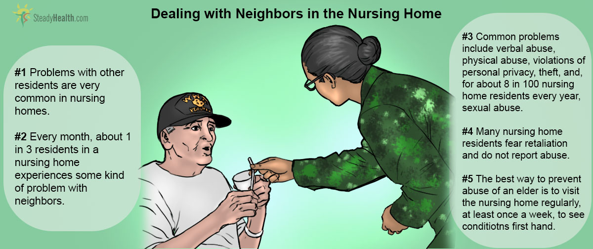 In the survey and observation of 2,000 nursing home residents, average age 84, 16.5% reported that they had been verbally abused in the past month, 6.5% that they had been physically abused. The study found that 10.5% of patients had their belongings had been rummaged through or stolen in that single month, or that other patients had entered their rooms uninvited. Problems between nursing home residents are so common, in fact, that many caregivers take them for granted.