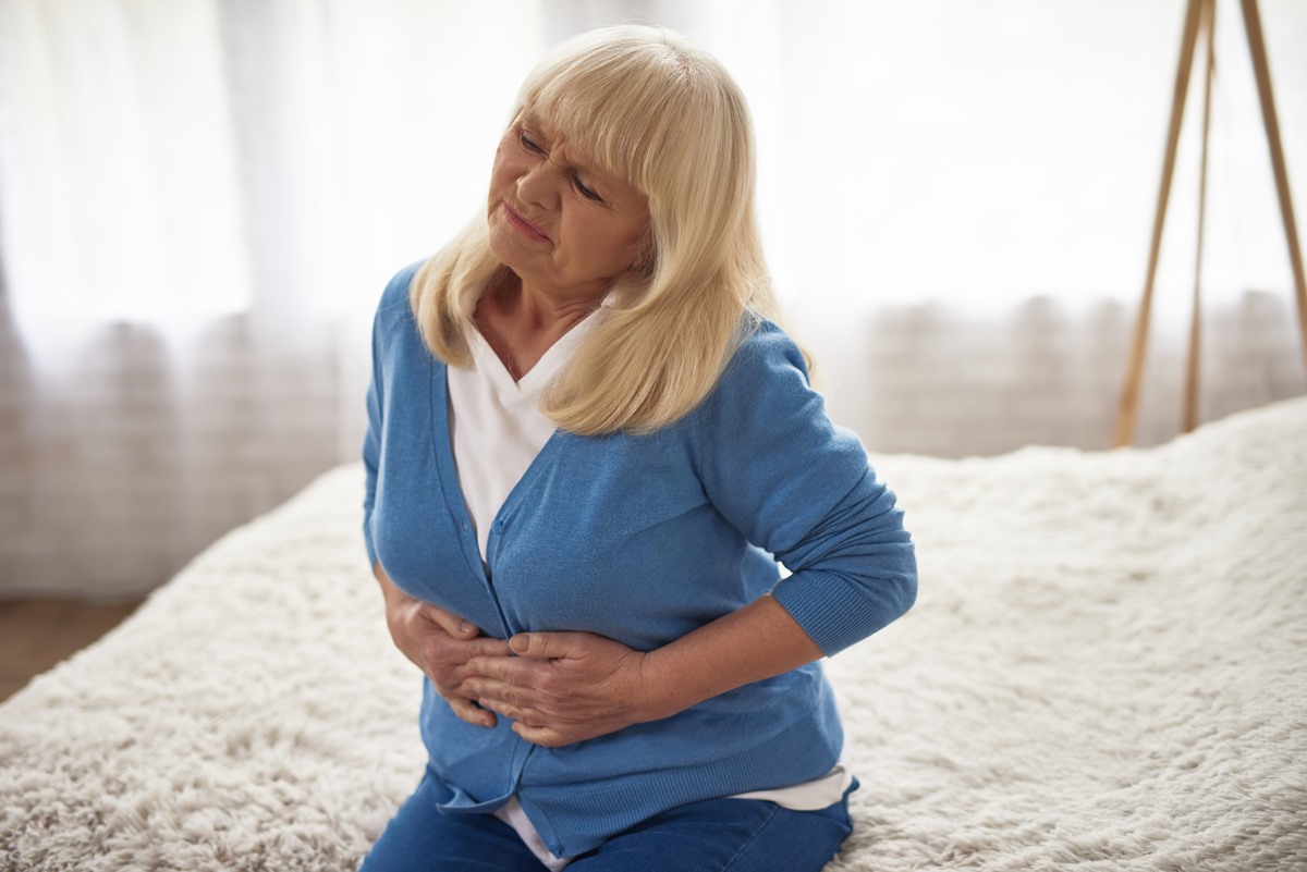Symptoms of gallstones include a dull pain or discomfort in the upper right portion of the abdomen, usually right below the ribs. The symptoms aggravate abruptly when the gallstone enters the smaller ducts leading from the gallbladder to the small intestine and get stuck inside of them. That stretches the wall of the ducts causing severe pain (also called biliary colic), nausea, and vomiting. Gallstones can also block the evacuation of bile from the gallbladder, causing increased pressure in the upper biliary ducts and subsequent accumulation of bilirubin in the blood. A person with increased bilirubin levels will have their eye sclera and skin colored yellow (jaundice or icterus).