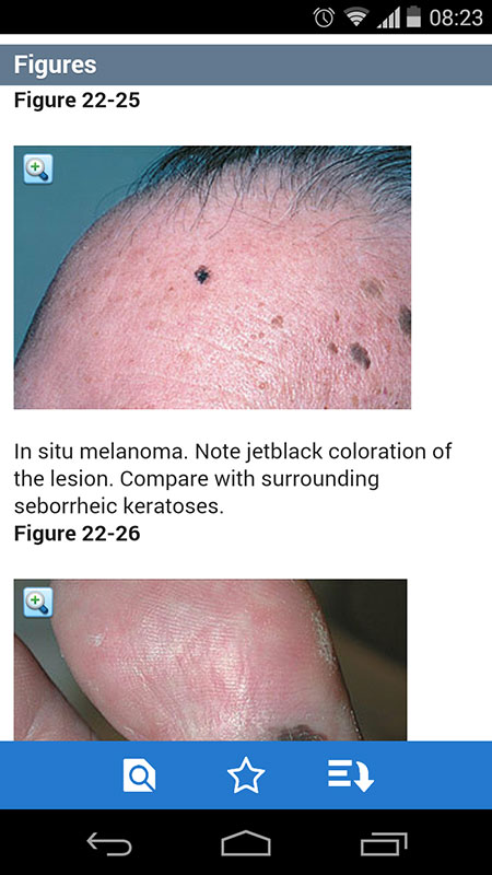The image collection covers dermatology conditions, with lot of them repeat themselves, such as various types of melanoma that opens the same section containing the same images. You can zoom in the images using the magnifier icon or your fingers, to see more details. But, the images are not high-quality.