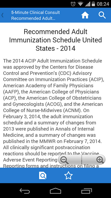 The app opens to a simple menu, which is basically a list that includes topics, i.e. conditions, medications, codes (ICD-9, ICD-10 and SNOMED), algorithms, images and 2014 immunization recommendations, as well as portions of U.S. Preventive Services Task Force recommendations.