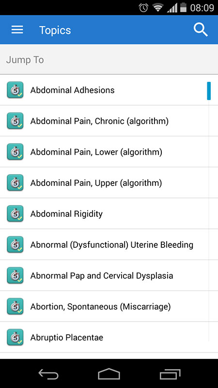 Once in topics section, you can select a condition by either scrolling down, or using the search function that is both fast and accurate. It will also prevent you from typing in the letter that won't return any entry, which is neat.