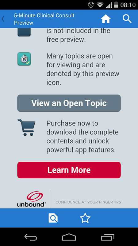 One of the apps that also allow users to have a glance at its features via limited free preview is 5-Minute Clinical Consult (5MCC) app developed by Unbound Medicine. The app is supposed to provide healthcare providers quick access to the information on how to diagnose, treat, and follow up with patients, as well as information on medications and associated conditions.