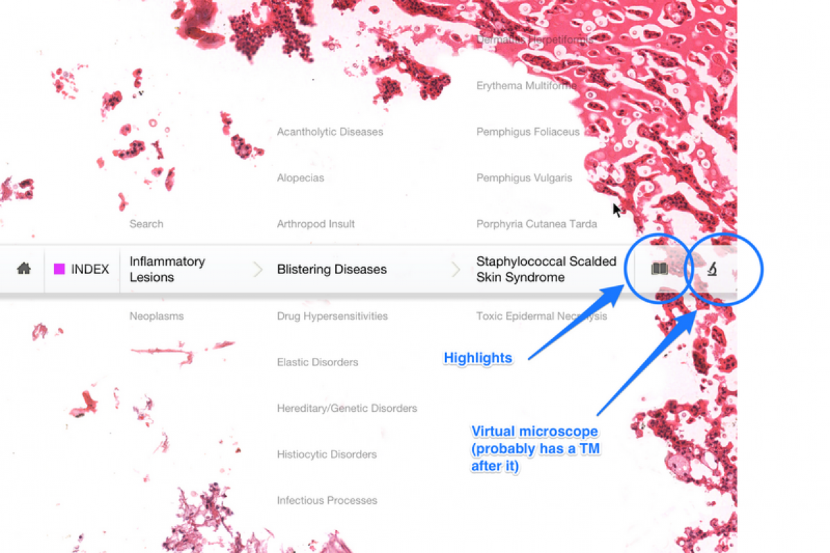 There are over 400 slides of common histological presentations of pathologies a user can select through in order to expand their understanding of the material. This application is available for download on only the iOS platform but is very useful if you have an iPad. A user is able to scroll through images at a 40x objective size so a user can review even microscopic details within the cell.