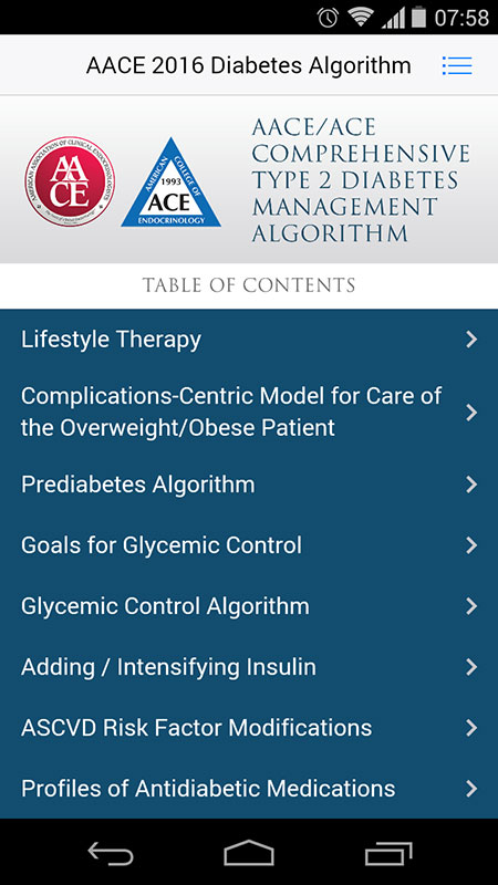 Today, I'm reviewing 2016 AACE Diabetes Algorithm app (still the most current on mobile stores) that introduced new treatments for diabetes, diabetes management tactics, and vital clinical data, including therapy optimization based on lifestyle, taking complications into consideration when treating overweight patients, safety-rank for anti-diabetic treatment, etc.