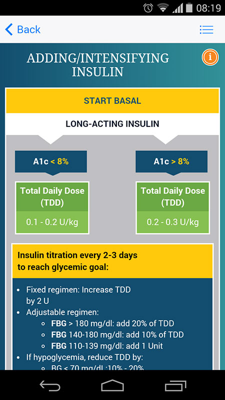 The app also gives other general recommendations, for example that any patient at 45 years of age should be tested regardless of their weight, that all type 2 diabetes patients should be initiated on metformin unless contraindicated or if they are intolerant to the medication, while patients with newly diagnosed type 2 diabetes and elevated blood glucose levels or A1C should be considered for insulin therapy.