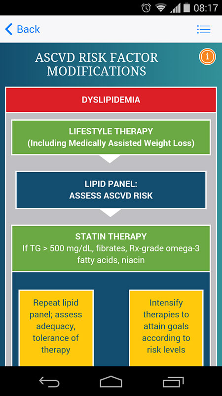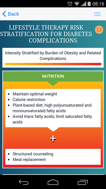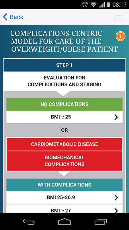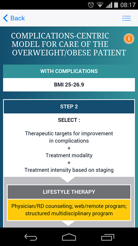 Tapping on any of the main features, opens a corresponding algorithm. For example, lifestyle therapies algorithm provides risk stratification by burden of obesity and related complications, while the following algorithm focuses on care of overweight/obese patients, with or without complications.