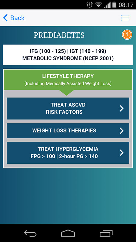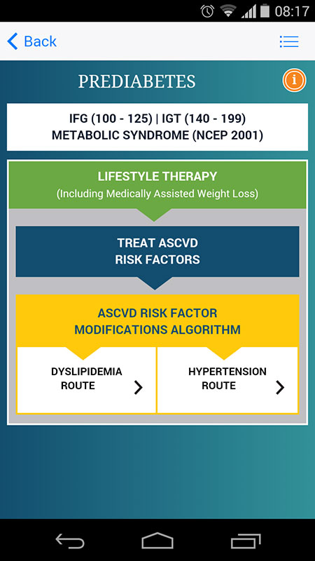 People with prediabetes have an increased risk of type 2 diabetes, heart disease, and stroke, but 90% of them don't know they have this condition. AACE Algorithm app also includes prediabetes algorithm that provides guidelines for treatment of patients who have borderline diabetes in an easy-to-comprehend format.