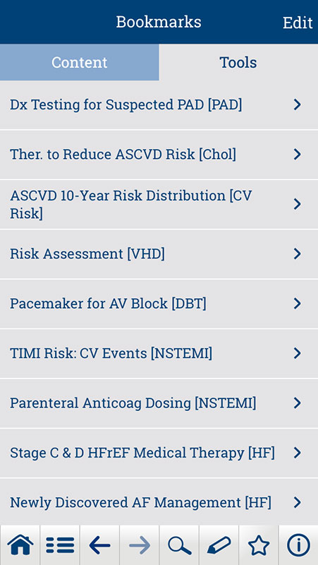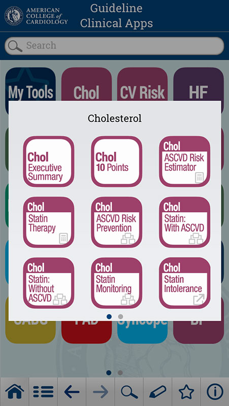 The Guideline Clinical App has included some of ACC's other apps such as ASCVD Risk Estimator, Statin Intolerance, and Anticoag Evaluator, which are available in particular guidelines, such as Cholesterol, Cardiovascular Risk, and Atrial Fibrillation. Other ACC apps, such as TreatHF app is also available as a tool in Heart Failure guideline section.