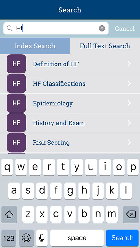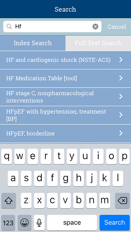 A search function that can be accessed from the home screen or the bottom navigation bar enables users to quickly find the term by index search or full-text search. Just start typing and the autocomplete will populate the list with the most accurate results.