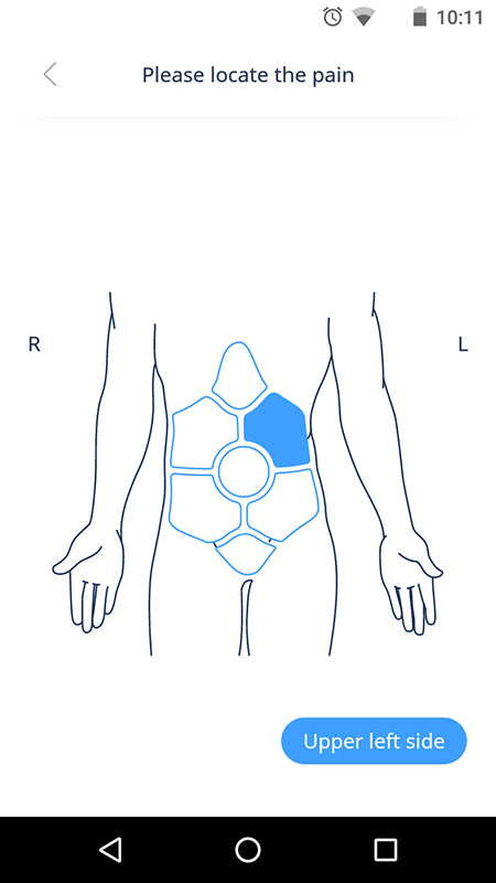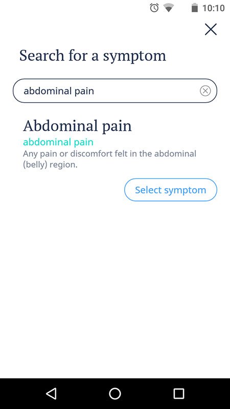 For the purpose of this review, I've looked up the 'abdominal pain' and then answered all the questions the app's AI asked afterward regarding the symptom.