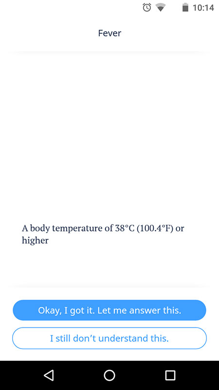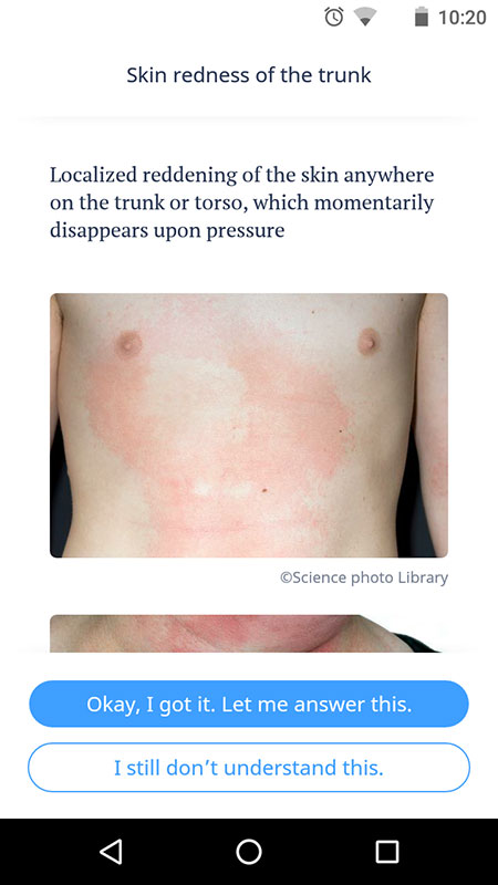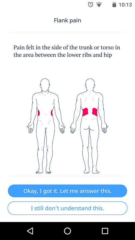 These explanations are provided in a form of text, photos (for example for skin rash or redness), or illustrations to help users better understand what certain questions mean. For example, what having a fever means, where to look up for the flank pain, etc.