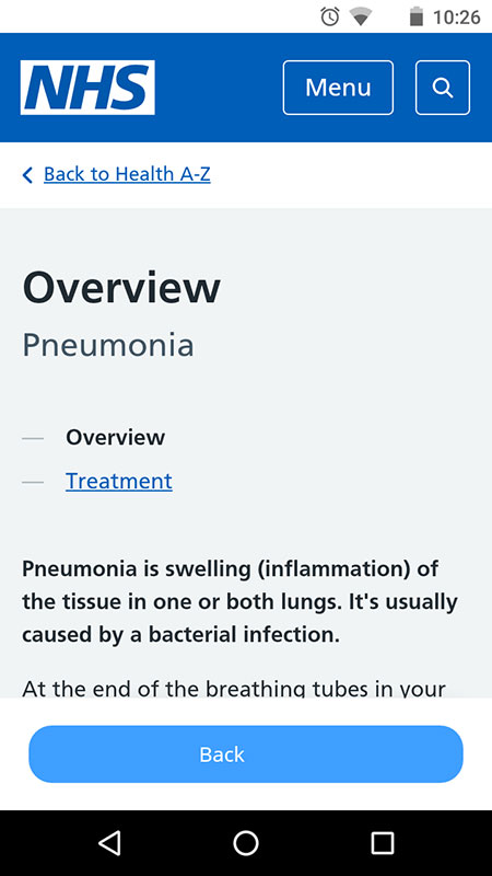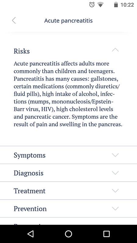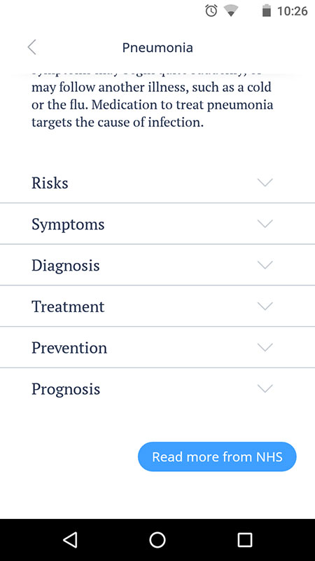 There is a Condition Library listing all health conditions that can be easily searched through thanks to the Search feature with auto-complete. Information about most of the conditions is provided in the same format with a link to NHS website for more info that opens in the app.