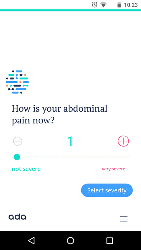 The Ada app also enables patients to monitor their health symptoms over time by selecting the number on a slider from 'Not severe' to 'Very severe.'