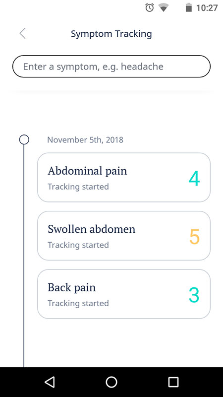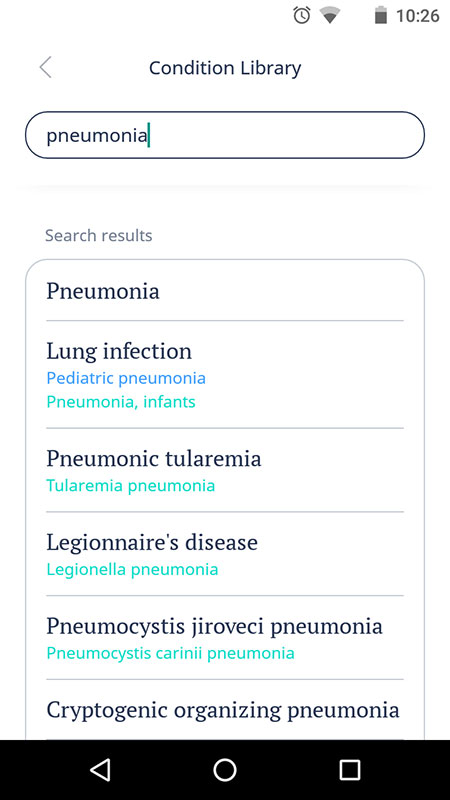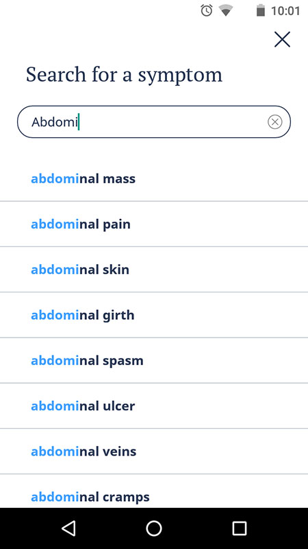 The app feature a search field that patients can use to enter the symptom that troubles them the most. The list of symptoms populates as you type, thanks to the auto-complete feature.