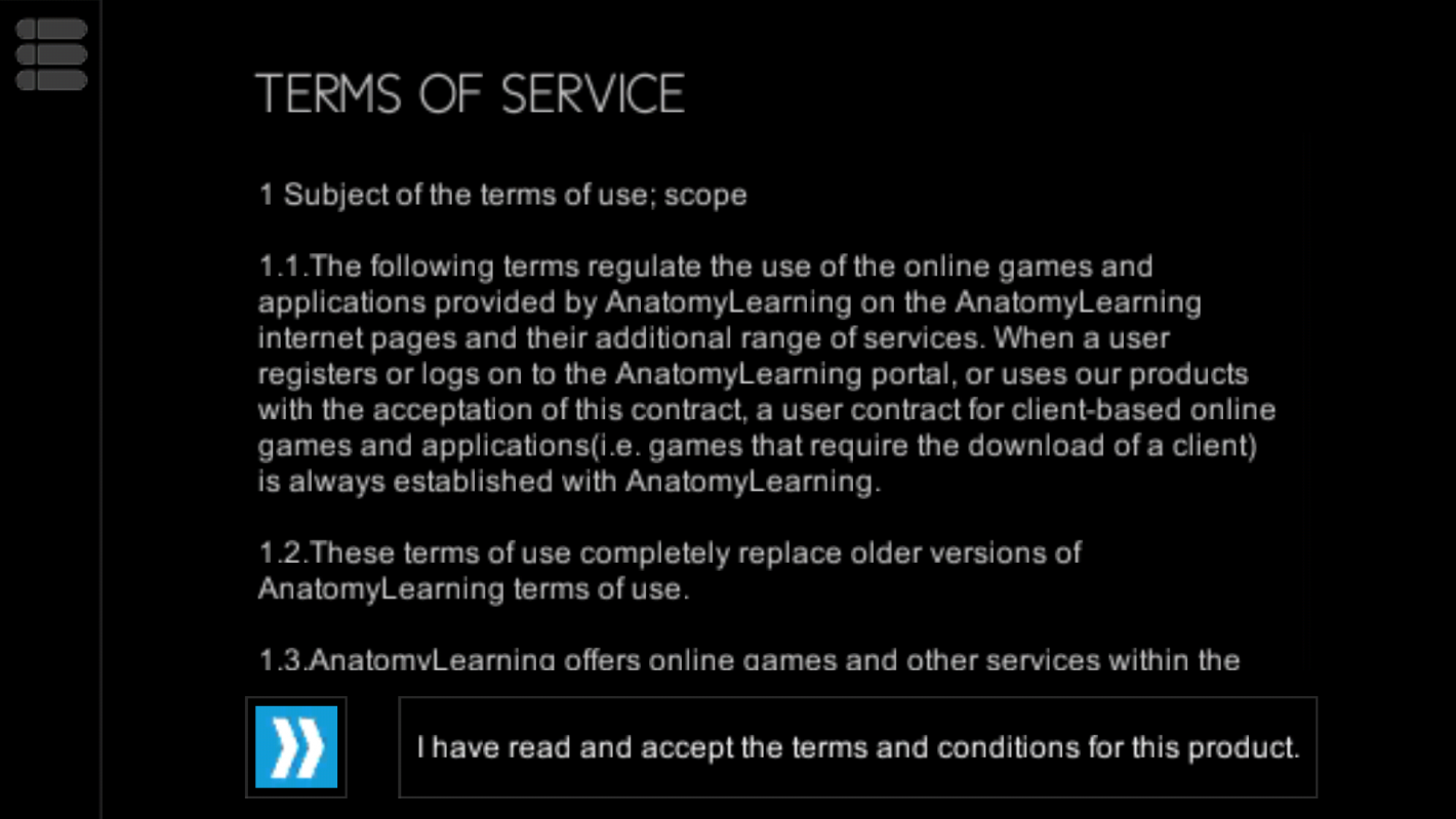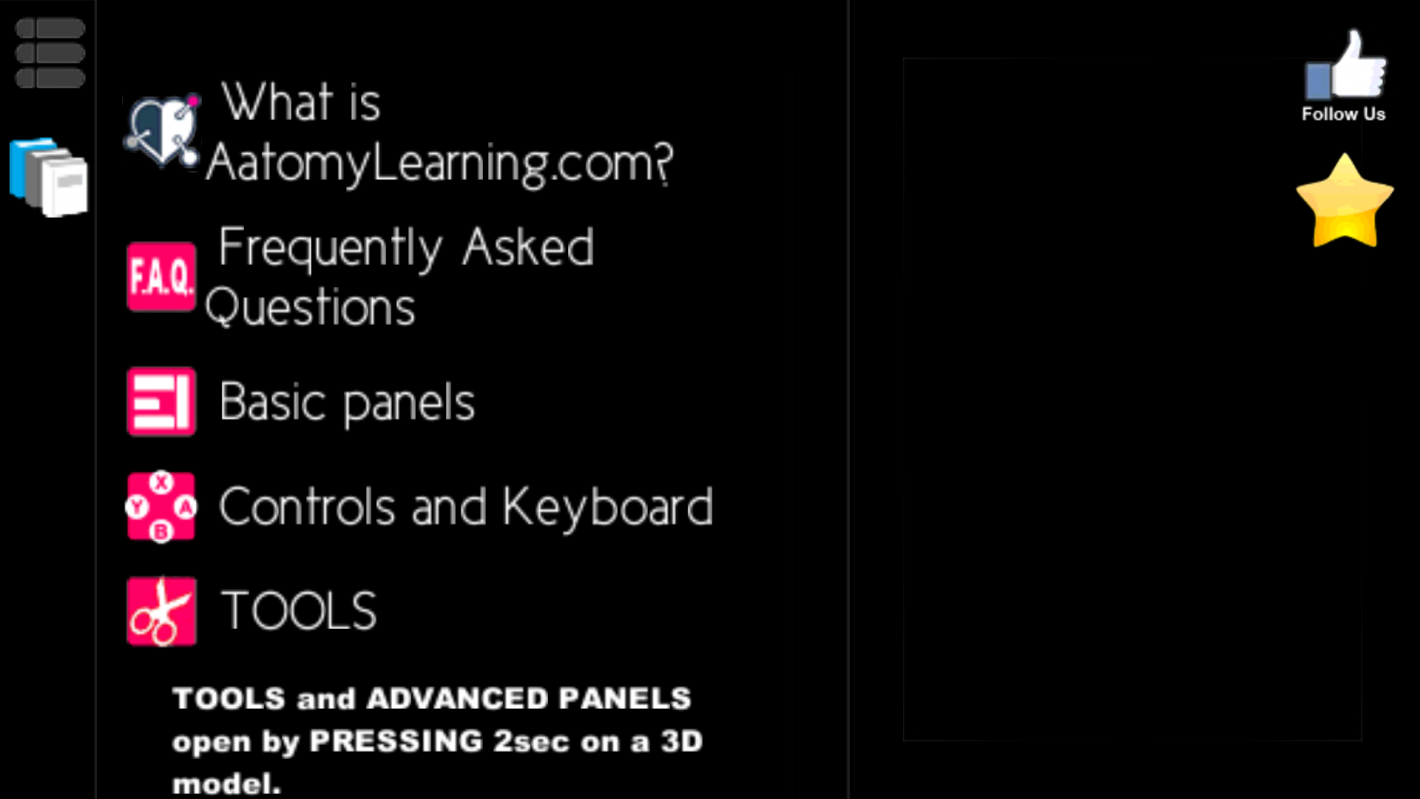 Back on the home page, there's a button on the top left of the screen. When this button is pressed, a drop-down screen comes up where you can find out more about Anatomy Learning, view Frequently Asked Questions and learn more about how to navigate the app and how to use the controls for better viewing of the anatomy models.