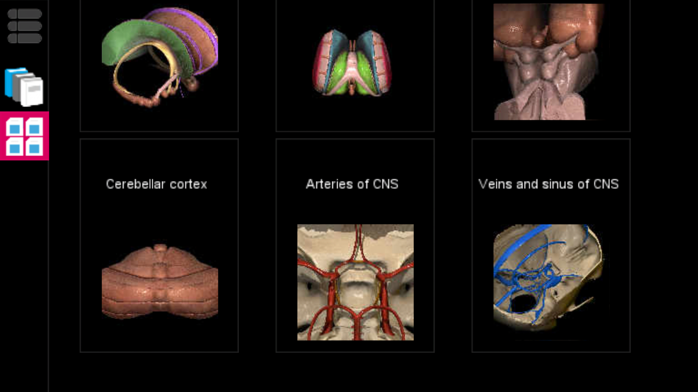 When you press on the desired anatomical area such as the central nervous system, for example, you will find different anatomical areas of the this system to explore. These areas include the limbic system, brain stem, cerebellum, arteries and venous structures of the brain. I chose the limbic system, and the app downloads the entire system for you to view.