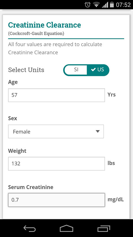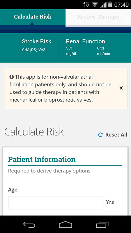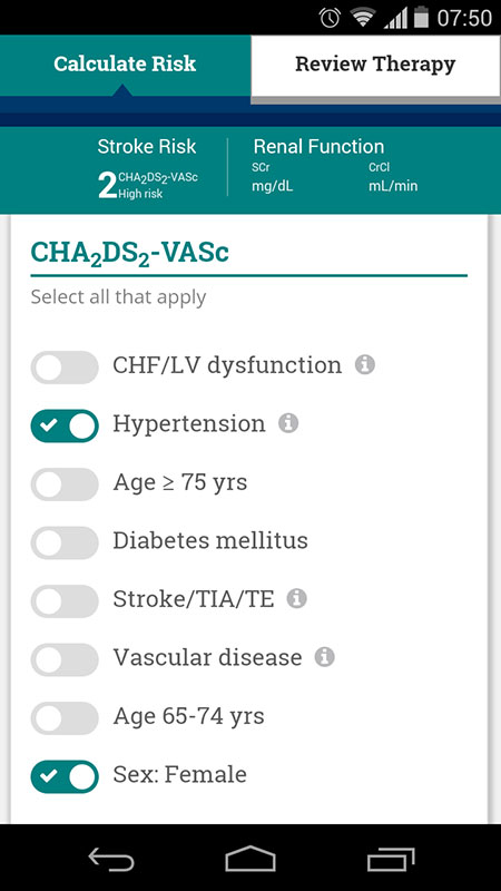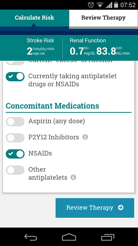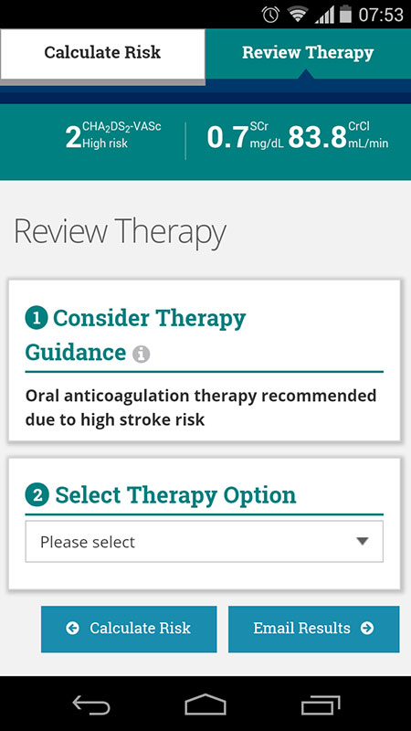 After entering all the information, the app automatically calculated the stroke risk, which was high in this case, along with the renal function, suggesting me to start oral anticoagulation therapy on the Review Therapy screen.