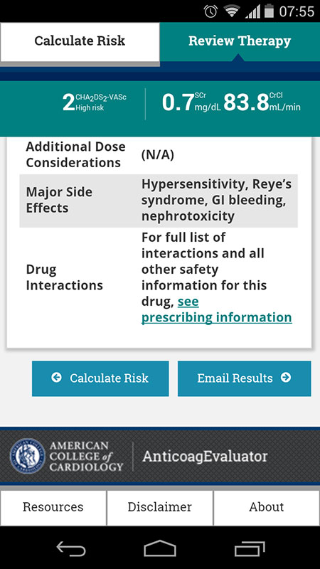 Another similar app we review today is AnticoagEvaluator app, created by the American College of Cardiology (ACC) with the goal to help clinicians dealing with these complex questions and decisions by providing specific numbers on stroke and bleeding risk, as well as benefits and risks of therapy with oral anticoagulants.