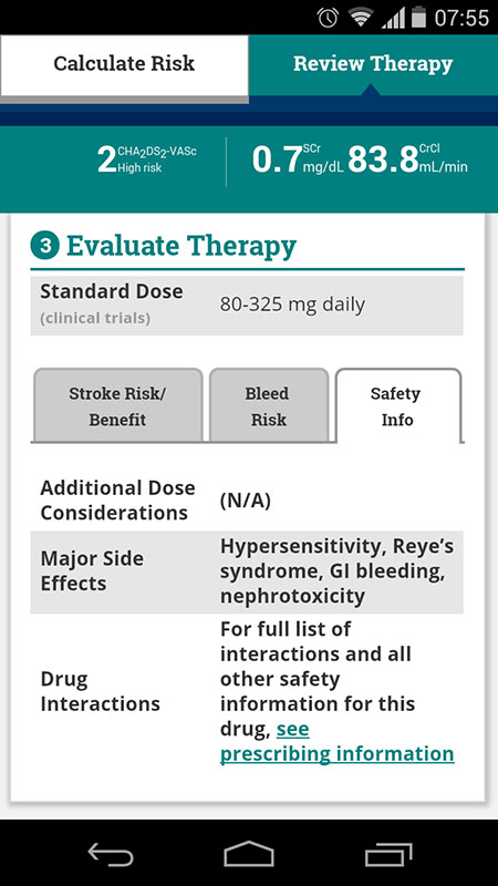 Choosing any of the medications from the list will provide you with further info on standard daily dose based on clinical trials, as well as information on stroke risk/benefit, bleeding risk, and safety information, which includes additional dose considerations, major side effects and interactions with other drugs.