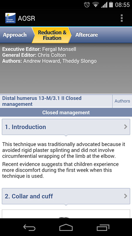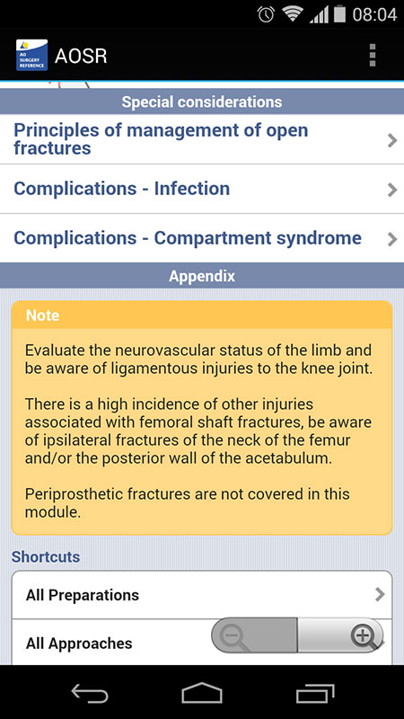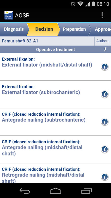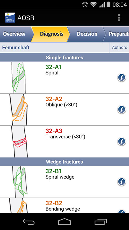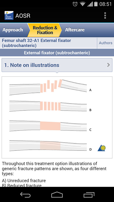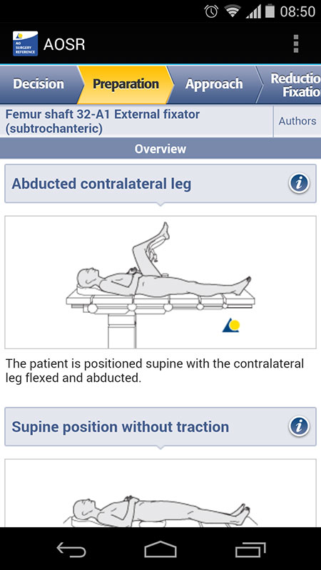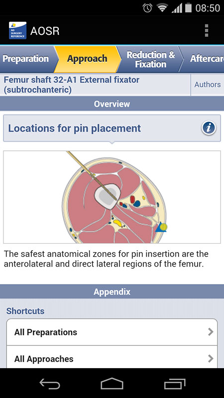 Beside Overview section, the AO Surgery Reference app also includes number of other steps, such as Diagnosis, Decision, Preparation, Approach, Reduction & Fixation, and Aftercare. The users must first choose the area of the fracture before these other steps are populated with the information.