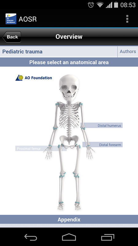 Upon starting the app you'll notice that it's almost as identical as the website, which isn't necessarily a good thing. The main screen features Overview section that allows users to tap on adult or pediatric skeleton to select a fracture area. But it's not that easy on the small screen, because transferring the web source into the app isn't done in a mobile-friendly way; at least not for all features.