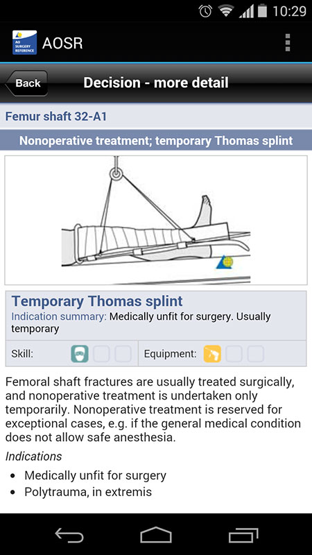 For this type of fracture, we got several recommendations. For non-operative treatment, it was temporary Thomas splint. Tapping on information button briefly explains the procedure, along with providing the useful legend about skills and equipment required for the procedure.
