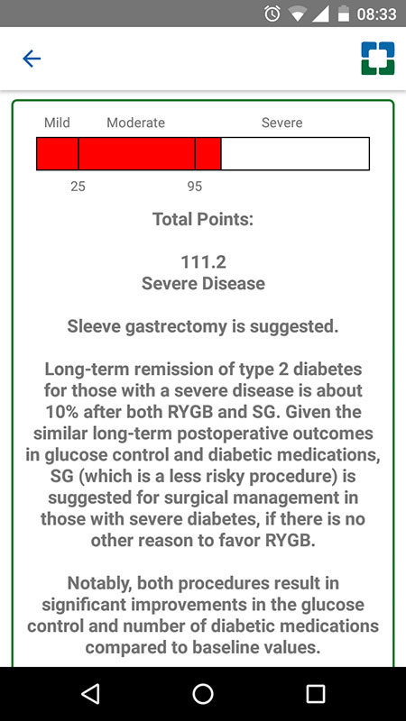 The calculation/estimate is given below the calculator, indicating the steps that should be taken. For example, if the patient has moderate diabetes gastric bypass would be recommended, while for the more severe cases the app would suggest sleeve gastrectomy.
