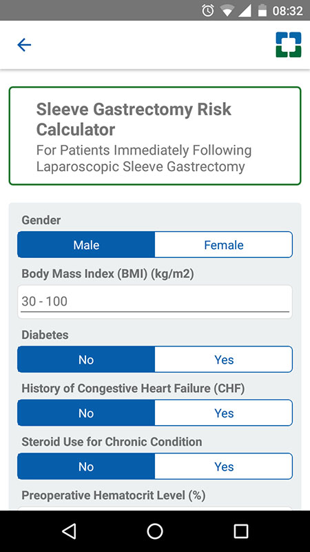 A sleeve gastrectomy (SG) is the most common bariatric procedure performed worldwide. The first calculator in this app – the SG risk calculator – tries to estimate serious adverse events that may happen after a sleeve gastrectomy.