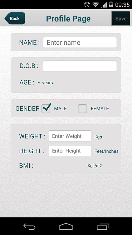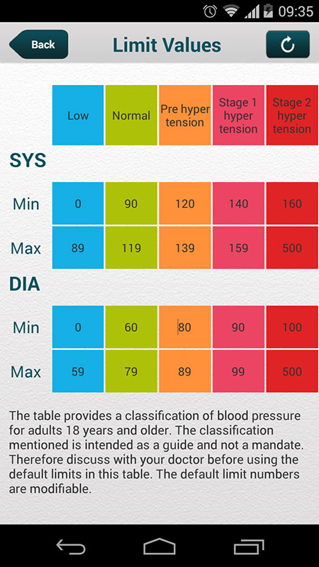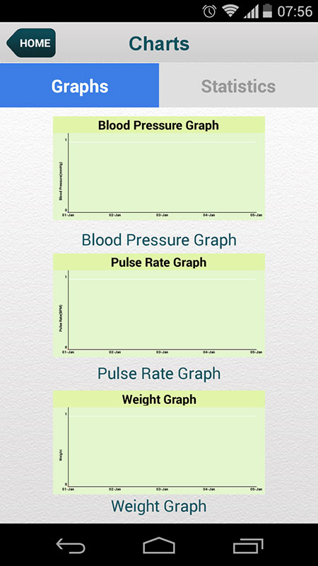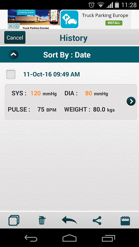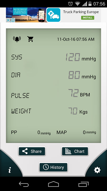 Upon opening the app, you see the blood pressure home page, made to resemble real BP device screen. Although simple, we found this as a nice touch. There are several options on this screen, which are straightforward. By default, it shows normal BP values for a reference, which are grayed-out. You can tap on each option and enter new values, for systolic and diastolic BP, heart rate and weight. Entering weight was required every time, instead of being optional, which would be more convenient.