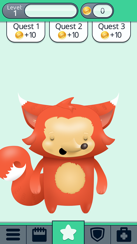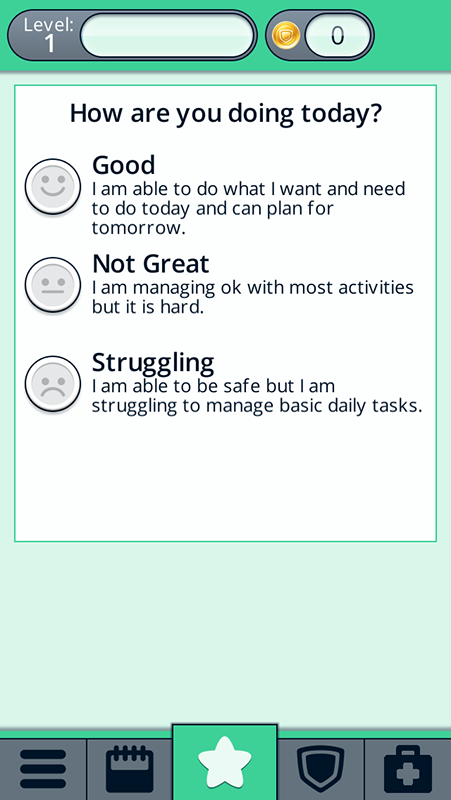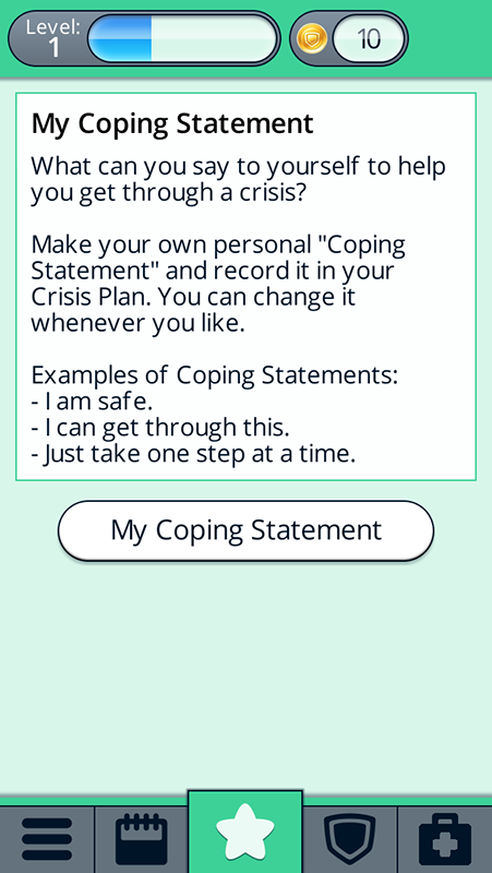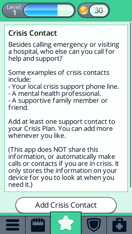 Basically, your Buddy is sleeping and your goal is to wake it up by completing quests and earning points for each level. For example, in Level 1 Quest 1 will require you to add emergency information, including emergency phone number and your hospital. Quest 2 will require you to add your coping statement that could help you get through a crisis, and in Quest 3 you'd be asked to add crisis contact, i.e. local support phone line, mental health professional, or your family member or a friend.