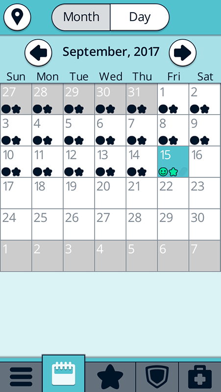 Besides an interaction with your Buddy, you can view the current date in a day or month form, with tasks completed, medications, as well as the ability to add the event or check in your mood or alcohol/substance use again.