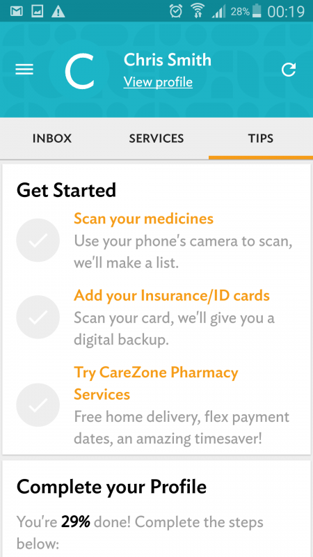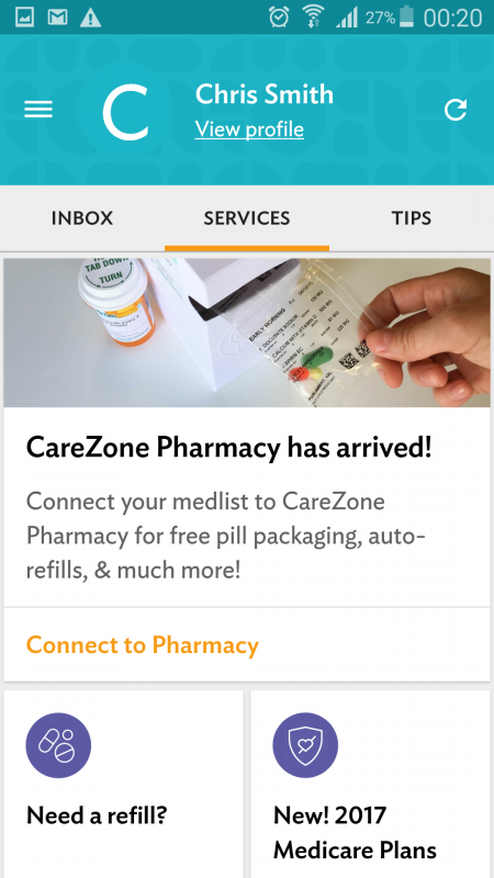 When the app is accessed, a page opens where you can set up an account by entering your name, e-mail address and password. Once you have done this, you are sent an e-mail by a CareZone care advisor stating that the flagship service of the company is free prescription home delivery through CareZone's Pharmacy Services. They say that they pre-sort the medication in pill packs, free of charge, for the patient. This is excellent marketing from their part as the latter service is one that a lot of patients will want, especially if it's offered at no extra cost.