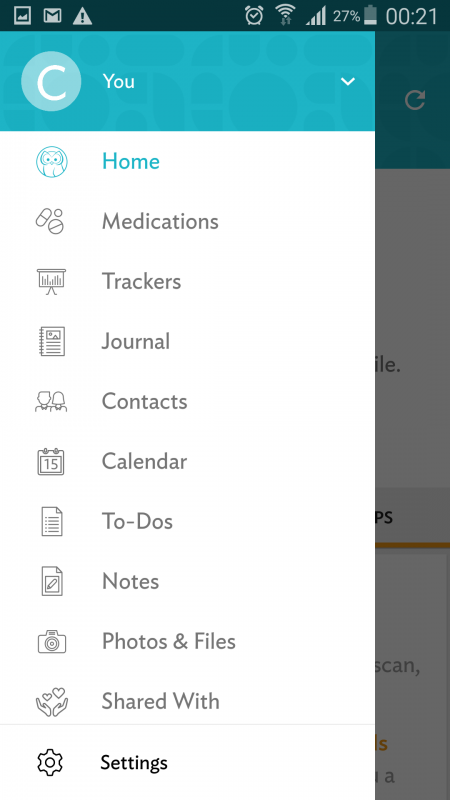 The home page opens up at the 'tips' page of the app where you can add personal details such as your date of birth, social security number, medical insurance information and you can even scan your medications by using the camera function of your phone or hand-held device.