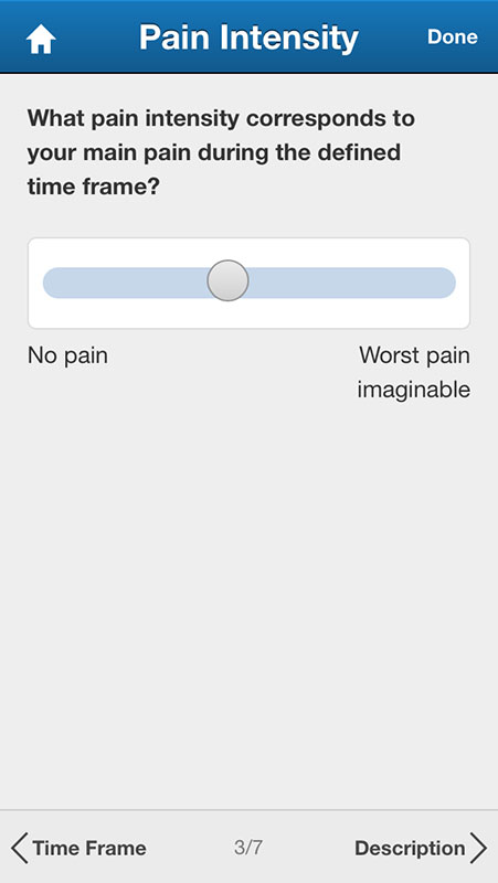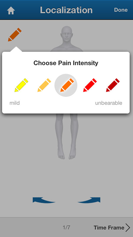 Users are first asked to describe the pain intensity by choosing one of the pencil icons that vary in color, from yellow for a mild pain to deep red for unbearable pain.
