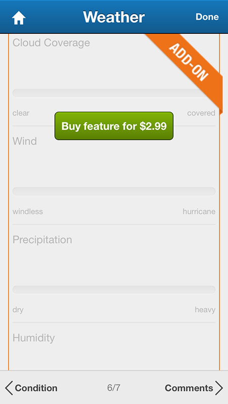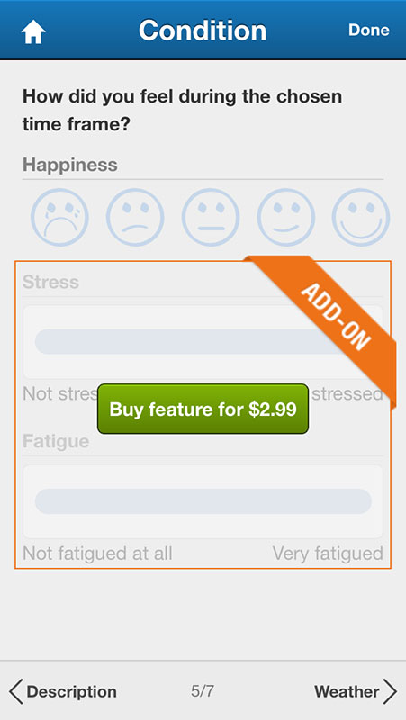 Here users can also add moods describing how they feel, however, this option is locked in the free version and requires the in-app purchase for $2.99. Too much money to be able only to add emoticons, if you ask me.