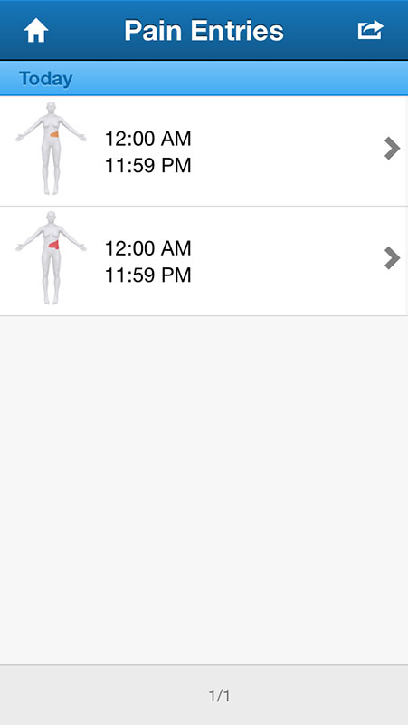 All pain entries you've added would be accessible via Pain Entries section on the Home page, providing a summary of each entry, along with four figures. I know it's easier to implement it that way, but it is redundant. For example, if the user has drawn a pain on the back of the figure, then why showing front and side views?