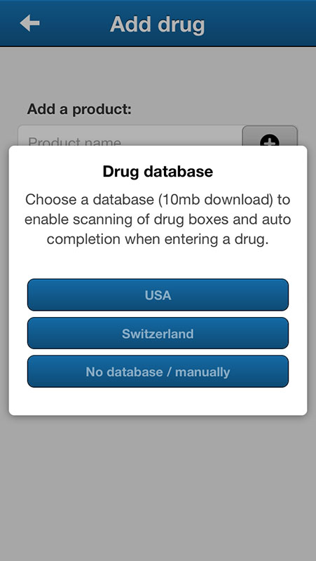 CatchMyPain app can be used as medication tracker as well. Go to My Meds section and tap on Add drug button. The app would offer to import tow drug databases (The USA or Switzerland) or you can add drugs manually (without database).