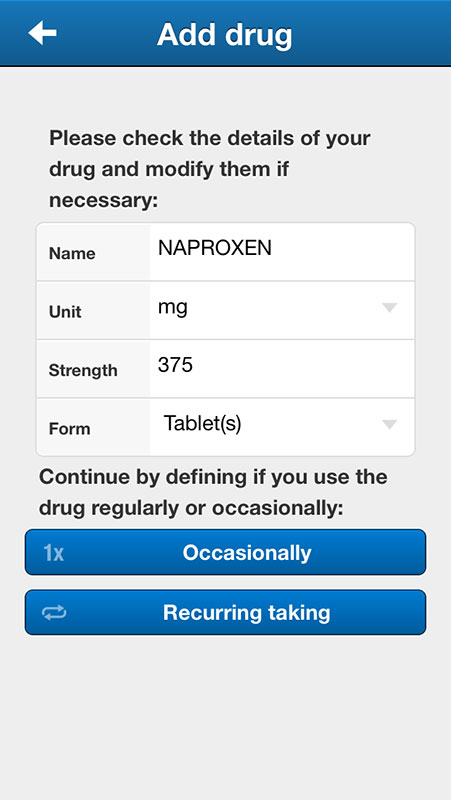 To add the drug, simply tap on the entry in the list and state if you're taking it occasionally (would require you to add drugs each time you take it) or recurring.