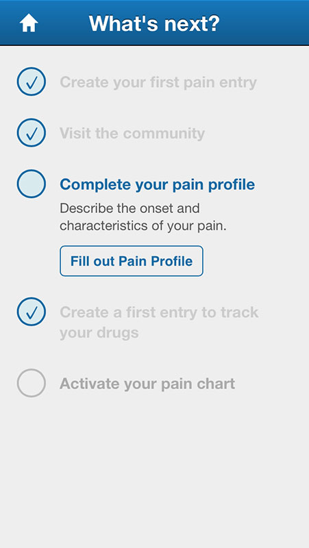 Upon opening the app, the users are guided through a quick tutorial on how to use the app, i.e. create the 'pain entry,' before they're taken to the Home page.