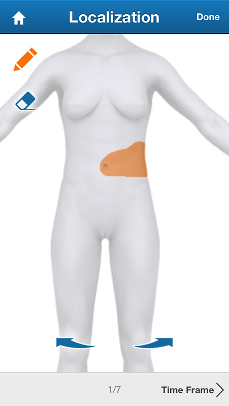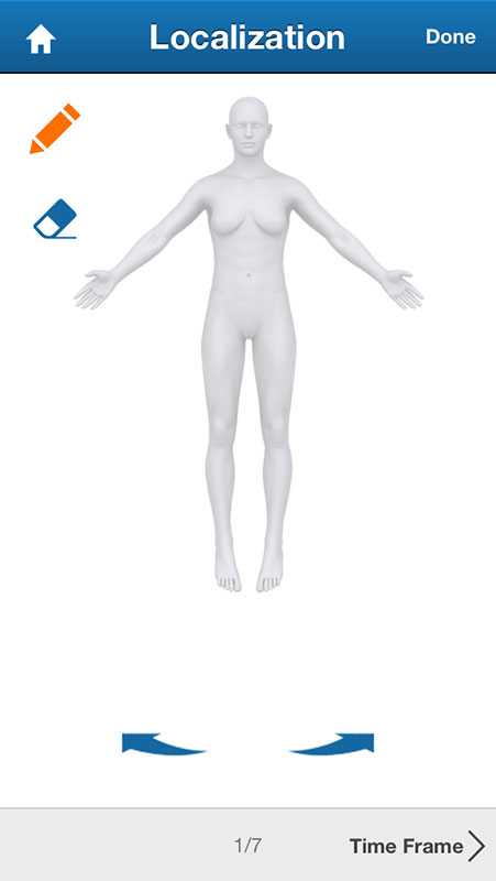 After choosing the pain level, a female figure would be displayed on the screen, allowing users to draw the pain using the pencil icon, or erase it and start again. Users can zoom in and move figure by using their fingers. Also, the figure can be rotated and seen from the sides, or from the back.
