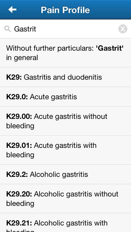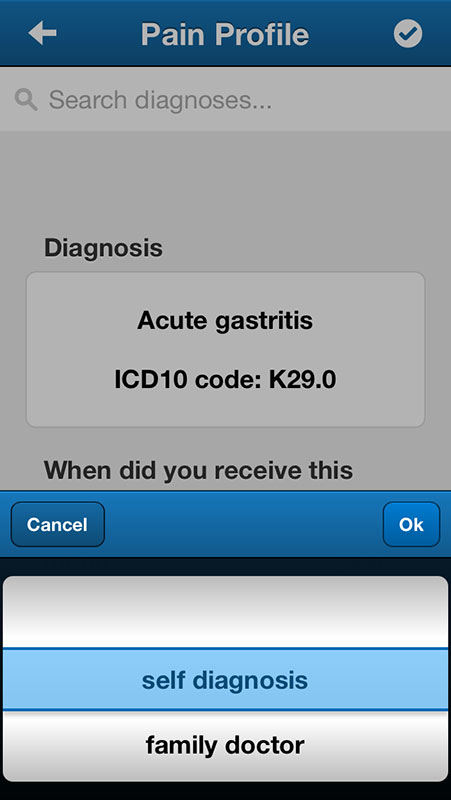 Another nice thing is the ability to create your own personal pain profile, by providing basic information about yourself and your pain, as well as you diagnoses (the app uses ICD-10 classification standard).