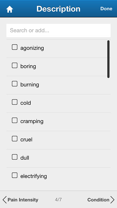 Once you've added the location, you can add time frame, pain intensity (again?) on not so responsive slider, and describe your pain from the list of descriptions, ranging from agonizing and dull, to throbbing and wavelike.