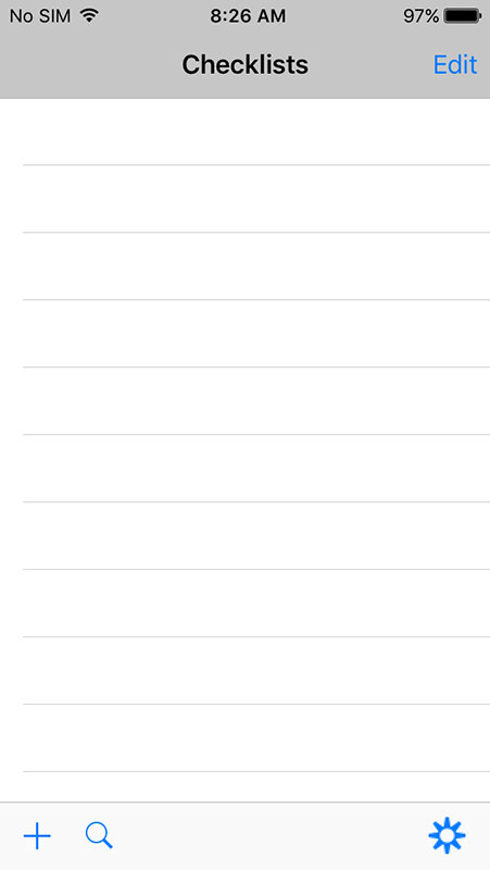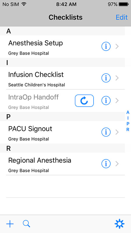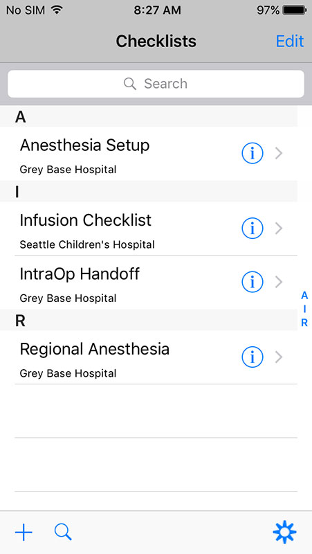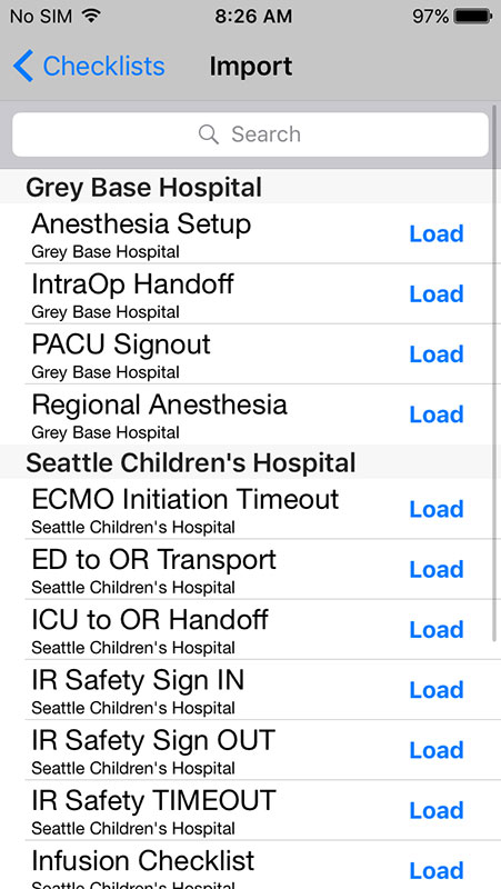 The app opens to an empty screen, requiring users to load checklists. This can be done by simply tapping on plus icon and select from the available checklists. Currently, the number of checklists available in the app is quite limited. There's only 15 checklists, four of them coming from Grey Base Hospital and the rest of Seattle Children's Hospital.