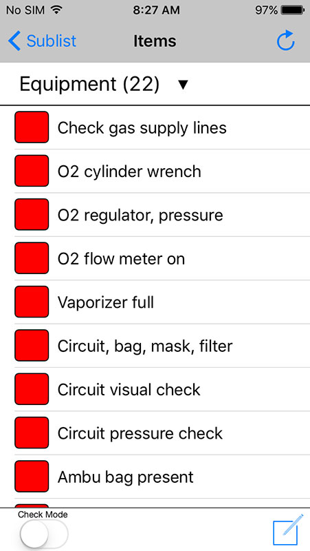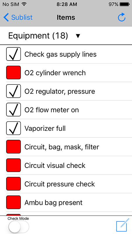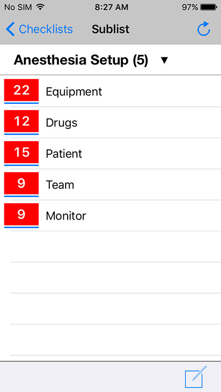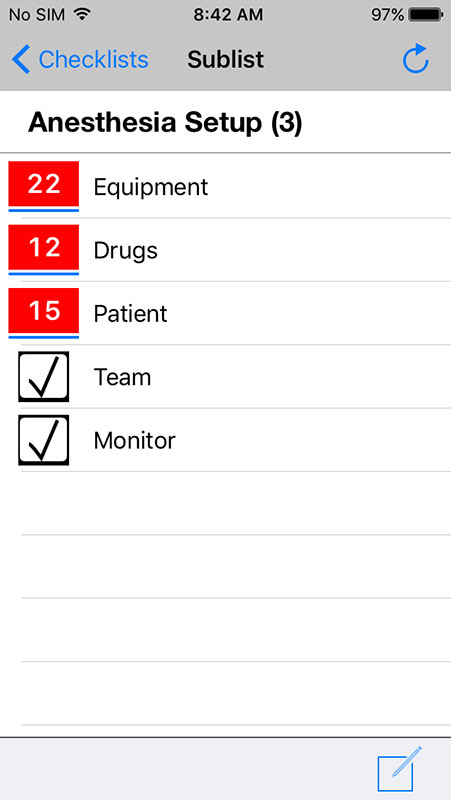 To open a checklist simply tap on it from the main screen. This would take you to the new screen that contains subtopics and items for each checklist. For example, if you opened "Anesthesia Setup" from Gray Base Hospital, you'd see five categories, including Equipment, Drugs, Patient, Team, and Monitor. Similarly, other checklists contain their own subcategories, which differ from the others.